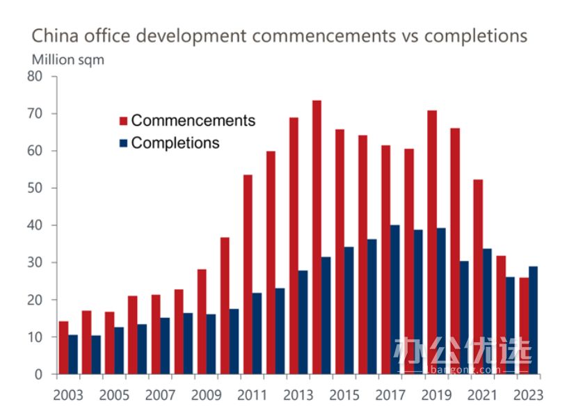 二十年来,中国写字楼项目的开工时间一直领先于竣工