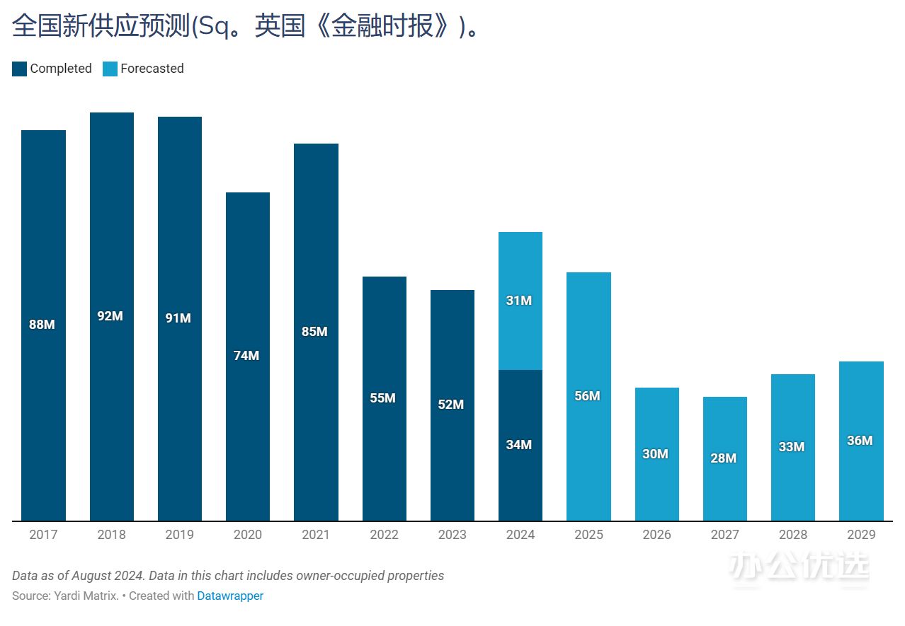 截至8月,总共完成了3430万平方英尺的办公空间,使2024年的办公交付量有望达到2013年以来的最低水平。由于需求疲软和资金昂贵,今年只是写字楼交付放缓的开始。2023年,办公室开工量降至3000万平方英尺,到2024年几乎完全枯竭,今年只有870万平方英尺的办公空间破土动工。