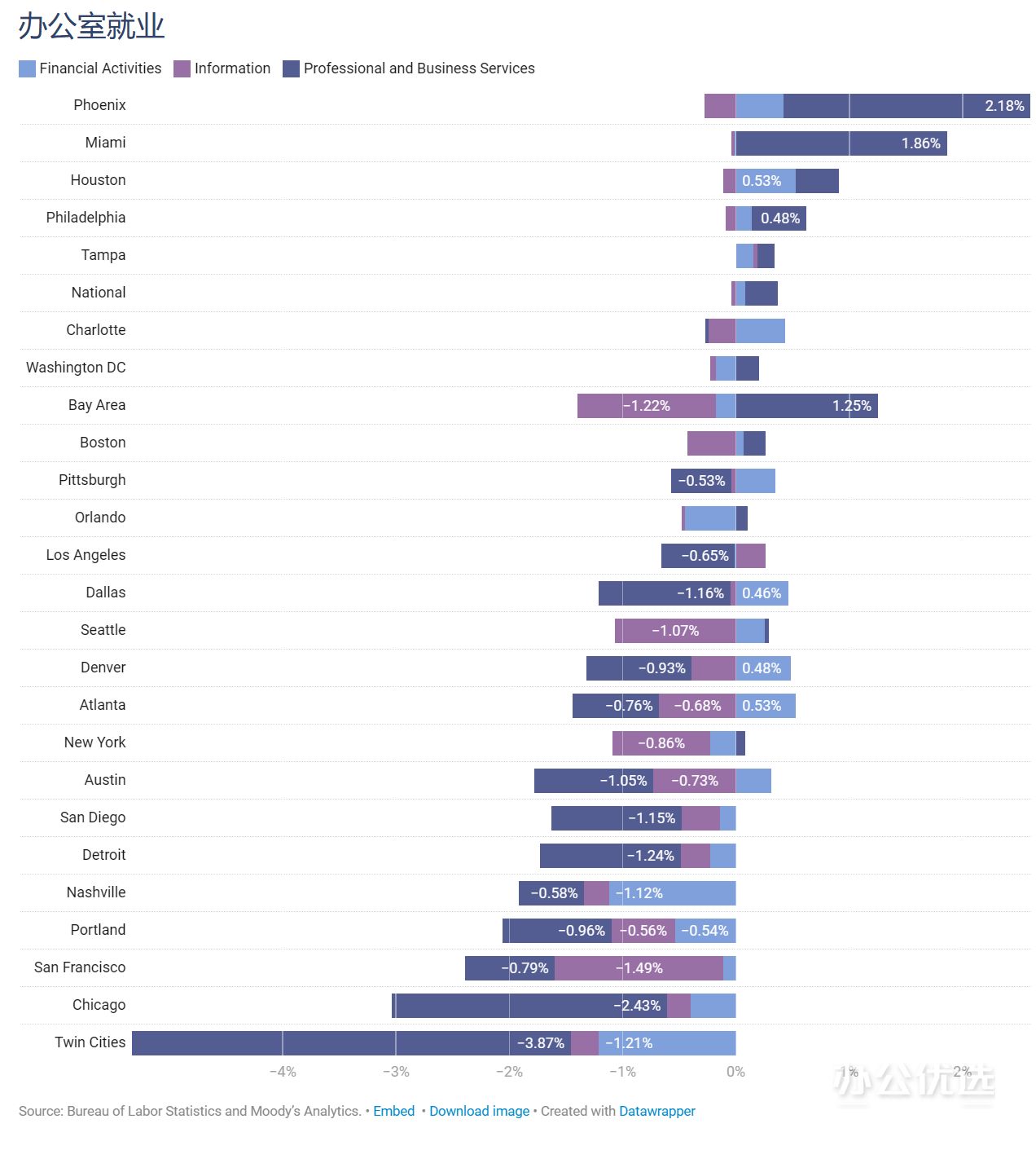 Metro 7月份的数据显示,在我们数据库覆盖的120个市场中,去年有80个市场的办公室工作岗位减少,另有16个市场的增长不到1%。随着远程和混合工作的盛行,新工作岗位的形成是增加办公需求的唯一途径,但这些领域的劳动力市场目前停滞不前。