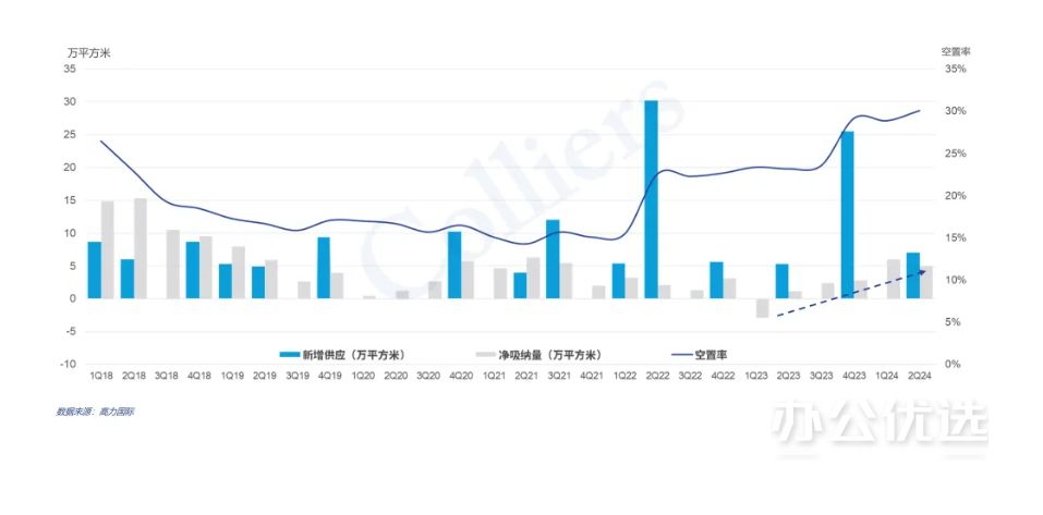 全市空置率环比上升1.2个百分点,至30.1%,同比上涨5.9%,市场空置压力持续高位;随着后续在建项目逐步竣备,新项目入市将进一步推高空置率,年末空置率预计或超过30%,市场竞争力压力将进一步凸显。