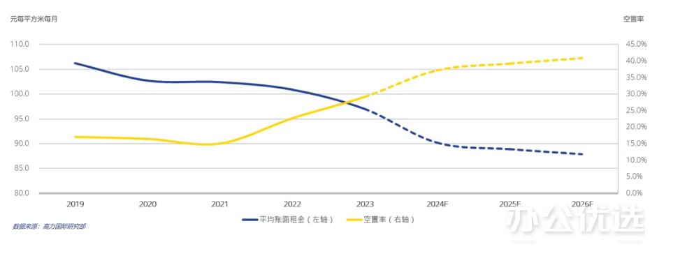 2024年市场持续恢复,上半年合计去化面积接近11万平方米,然而需求侧市场观望情绪还较为浓烈,企业扩张依然偏保守;截止今年上半年,空置率依然维持高位,账面租金持续下降;预计未来三年,如果新增需求无法如期恢复,随着更多的新项目进入市场,整体空置率将持续攀升,市场去化压力加大的同时,平均租金将进一步下探。