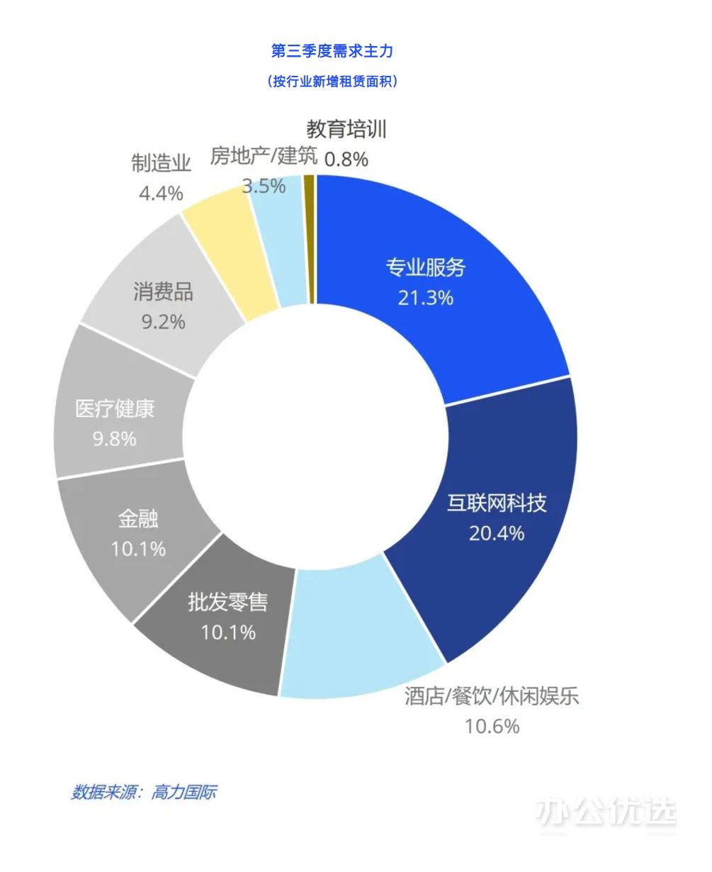 三季度,成都市甲级写字楼净吸纳量约6,800平方米,城东北和天府新区去化略微领先;在新增需求放缓的同时,部分项目还在经历大租户退租调整。从行业需求来看,专业服务和互联网科技稳居前列。