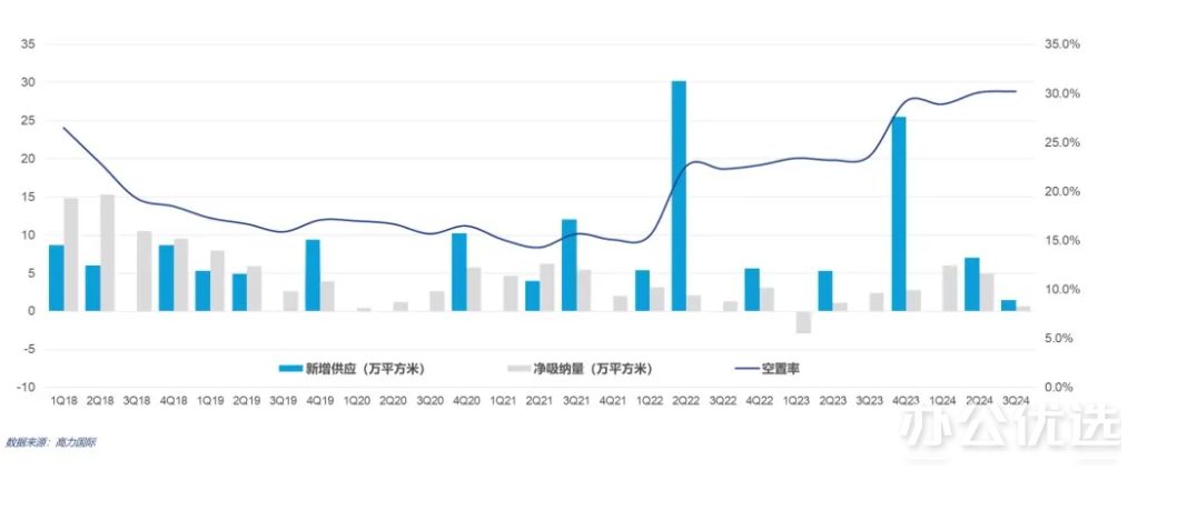 全市空置率环比上升0.1个百分点,至30.2%,同比上涨6.6%,市场空置压力较大;由于项目延期,年底的空置率将有所回落,但2025年的预估空置率将进一步上升。