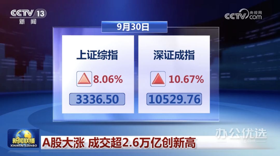9月30日,央视《新闻联播》以“A股大涨 成交超2.6万亿创新高”为题再次报道A股,报道时间近40秒。A股市场迎来了一波强劲的上涨行情,这不仅在资本市场引起了广泛的关注,也为写字楼市场带来了一系列启示。根据最新的市场分析和数据,我们可以从以下几个方面来探讨A股大涨对写字楼市场的潜在影响。